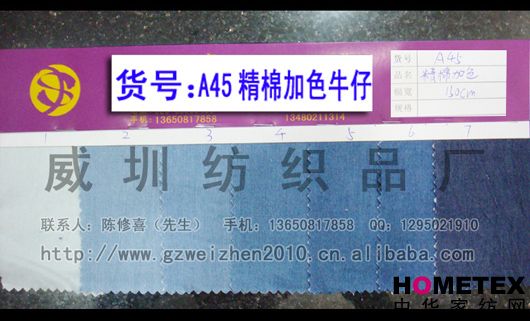 織物組織:平紋 幅寬:150cm 品名:純棉牛仔 密度:64*47 水洗工藝:砂洗 貨號:A45精棉加色 重量:* 具體用途:休閑服、工作服、褲裝、時裝 別名:A45精棉加色 印染工藝:印花 成分及含量:100%棉 主要用途:服裝用布 ======================================================================= 以上產(chǎn)品全部現(xiàn)貨供應,可隨時提供樣布卡和現(xiàn)貨,隨時發(fā)貨。所有產(chǎn)品全部是廠家直銷價,我們承諾:以超低利潤營銷,我 們只求銷售量。為保證您的利益,我司建議您在采購前先確認我們的品質(zhì)樣與顏色樣后再拿大貨,期待與您的真誠合作。因產(chǎn) 品種類較多,具體參考未盡詳盡,如有需要,請您與我們聯(lián)系。 瑞豐紡織(中大旗艦店)坐落于國內(nèi)最大的紡織面料產(chǎn)業(yè)中心—廣州中大,是一家專業(yè)銷售面料的廠家直銷商。主要經(jīng) 營產(chǎn)品有:全棉凈色、仿記憶絲面料、全棉(TC)色織等,面料品種花達上千余種,所有產(chǎn)品全部現(xiàn)貨經(jīng)營。 我們面料的品質(zhì)來源于:1、采用國內(nèi)外優(yōu)質(zhì)的原材料;2、使用精良的生產(chǎn)工藝和設(shè)備;3、完善的生產(chǎn)質(zhì)量管理體系。我 們具有開發(fā)和創(chuàng)新品種的強烈意識和優(yōu)越條件,并根據(jù)客戶需求與市場變化時時推出潮流面料。憑著多年的專業(yè)行業(yè)經(jīng)驗,根 據(jù)客戶需求,不論客戶在全國任何地方,只要提供小樣,就可在一兩天時間內(nèi)輕松獲得所需面料的信息。 批發(fā)說明供應商支持混批 。 ============================================================= 有意請加QQ:1295021910或電話聯(lián)系。 公司名稱:威圳紡織品廠 聯(lián)系人:陳修喜先生 手機:13650817858 網(wǎng)址:http://www.gzweizhen2010.cn.alibaba.com =============================================================