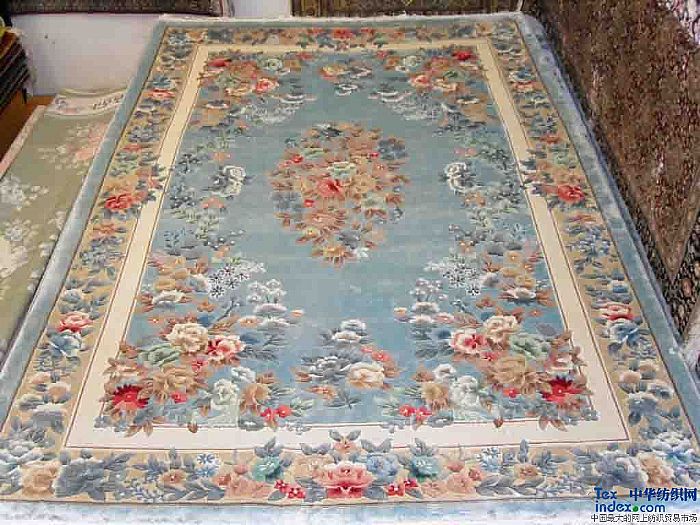 顏色及圖案:天藍(lán)色地,白色、粉色花紋圖案,手工編織真絲地毯,可給居室裝潢明亮浪漫的感覺。